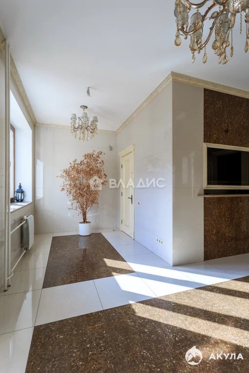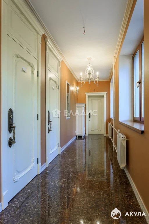 При отделке использованы дорогие материалы. Натуральный камень, износостойкий керамогранит и ламинат под красное дерево, итальянские двери и батареи в классическом стиле, светильники с кристаллами Сваровски.