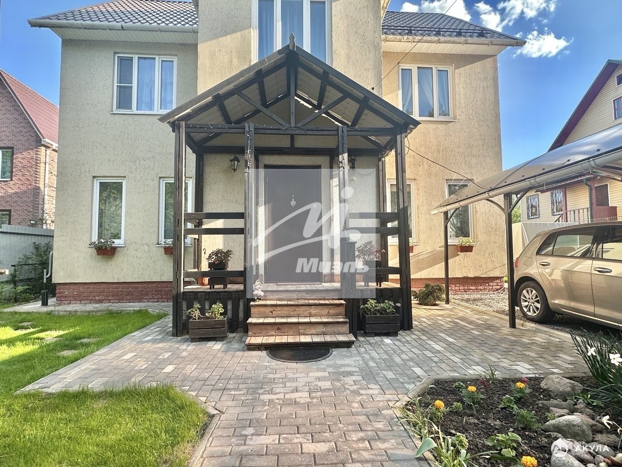 Участок 5 соток, ровный, правильной формы, с декоративными растениями, плодовыми деревьями, грядками. Отмостка дома и пешеходная зона выложена брусчаткой.