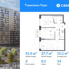Строим кварталы для жизни с заботой о будущем. Предлагается 2-комнатная квартира комфорт-класса 51, 5 кв.м в корпусе 6.1 на 14 этаже, в ЖК «Томилино Парк» Квартира с предчистовой отделкой. Доступность дополнительных опций уточняйте у застройщика. Приобрести квартиру возможно...