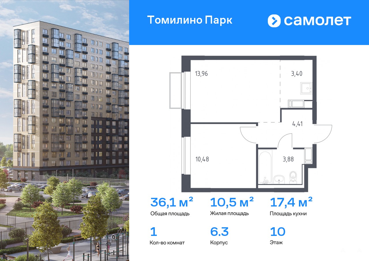 Строим кварталы для жизни с заботой о будущем. Предлагается 1-комнатная квартира комфорт-класса 36, 13 кв.м в корпусе 6.3 на 10 этаже, в ЖК «Томилино Парк»