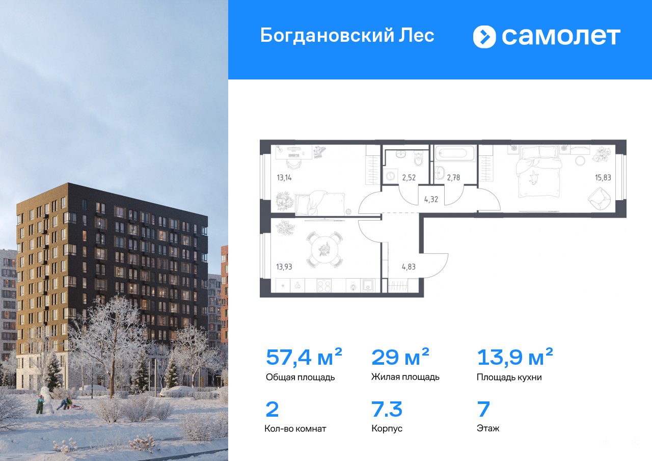 Строим кварталы для жизни с заботой о будущем. Предлагается 2-комнатная квартира комфорт-класса 57, 35 кв.м в корпусе 7.3 на 7 этаже, в ЖК «Богдановский Лес»