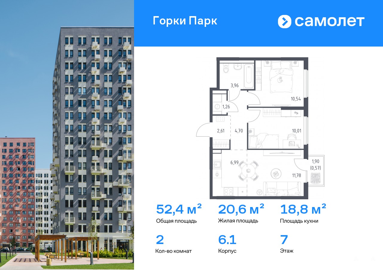 Строим кварталы для жизни с заботой о будущем. Предлагается 2-комнатная квартира комфорт-класса 52, 42 кв.м в корпусе 6.1 на 7 этаже, в ЖК «Горки Парк»